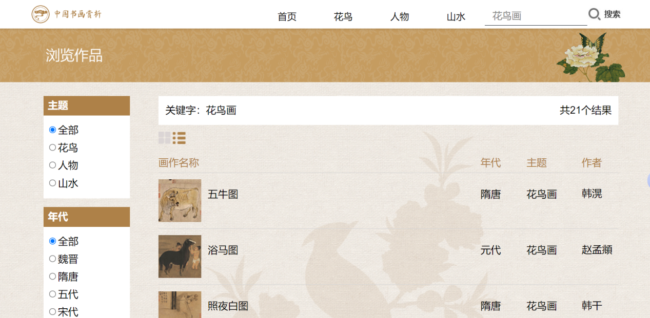 平台构建了详尽的分类体系,不仅根据创作年代、创作题材对所有作品进行了细致的区分,而且还设置了快速检索功能,方便观者通过不同的方式迅速找到目标作品。