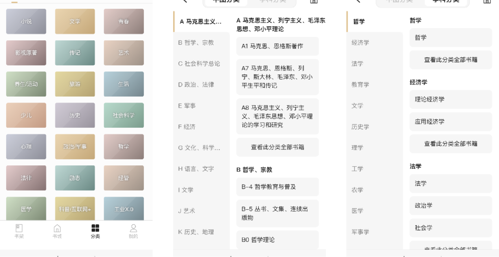 掌阅精选书籍提供三种分类方式,一是根据掌阅十余年的数字阅读行业经验,总结出21个大类、60个小分类的自有分类,方便读者查阅相关书籍;二是支持中图法分类,满足图书馆资源统计需求;三是提供学科分类,覆盖经济学、法学、历史学、理学、工学、农学等14个学科门类,可充分满足读者学习、教学与研究。